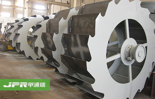 工作時,電機通過三角帶、減速機、齒輪減速后帶動葉輪緩慢轉動,砂石有給料槽進入洗槽中,在葉輪的帶動下翻滾,并互相研磨,除去覆蓋砂石表面的雜質, 同時破壞包覆砂粒的水汽層,以利于脫水;同時加水,形成強大水流,及時將雜質及比重小的異物帶走,并從溢出口洗槽排出,完成清洗作用。干凈的砂石由葉片帶 走,后砂石從旋轉的葉輪倒入出料槽,完成砂石的清洗作用。